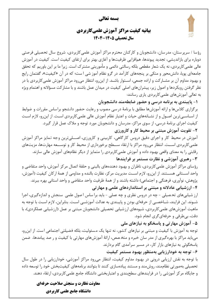 بیانیه کیفیت مراکز آموزش علمی کاربردی سال تحصیلی 1404-1405 علمی کاربردی شام شام فوریه 25, 2024 اکتبر 4, 2025 دستهبندی نشده نوشته قبلی آشنایی با سیستمهای اطلاعاتی در سازمان و مدیریت نوشته بعدی آشنایی با مراحل قیف فروش