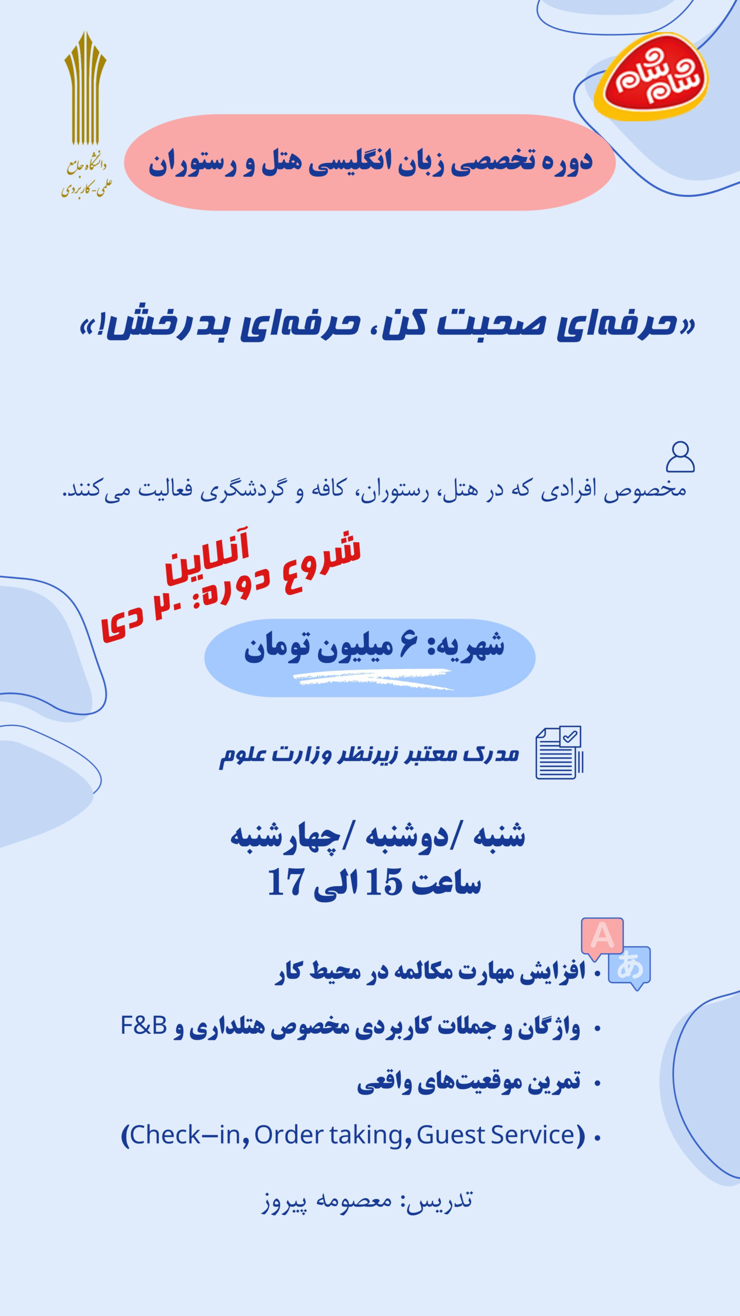 دوره زبان تخصصی هتل ورستوران (۲۰ جلسه آنلاین)