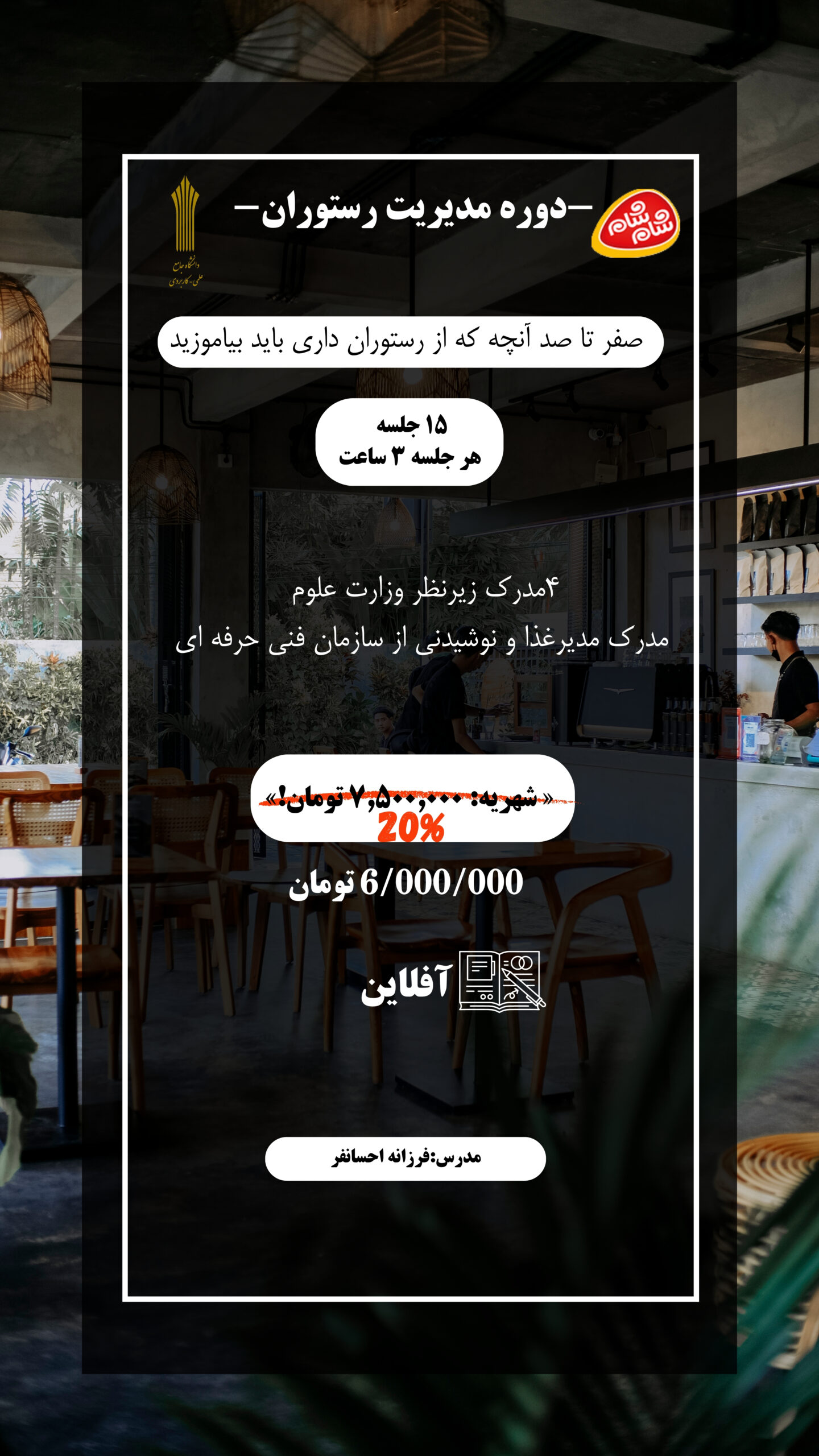 دوره مدیریت رستوران به صورت آفلاین و یک جلسه حضوری/آنلاین